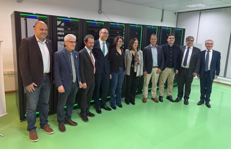 Representantes da USP, Positivo Servers & Solutions, Supermicro, NVIDIA e Scherm à frente do supercomputador Jairu. – Imagem: Positivo Servers & Solutions (divulgação)