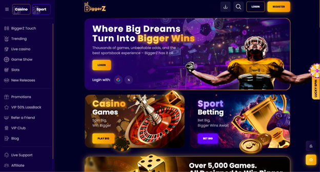 Visão Geral da Empresa: O BiggerZ abriu suas portas em agosto de 2025 como uma plataforma exclusivamente cripto, licenciada pela Comissão de Jogos de Anjouan. O casino oferece mais de 5.000 jogos de mais de 50 provedores de software, incluindo Evolution e Pragmatic Play Live, cobrindo mais de 4.500 slots, 350 mesas de dealer ao vivo e exclusivos BiggerZ Originals. Todas as 12 moedas suportadas permitem depósitos instantâneos, retiradas sem taxas e um depósito mínimo de apenas 10 USDT. O programa VIP oferece 5% de rakeback diário, e membros VIP recebem uma funcionalidade de “lossback” de 50% para suavizar as perdas.