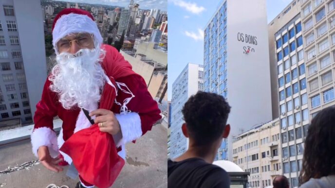 Vestido de Papai Noel, o artista urbano Gardpam realizou uma intervenção artística especial de Natal em um prédio…